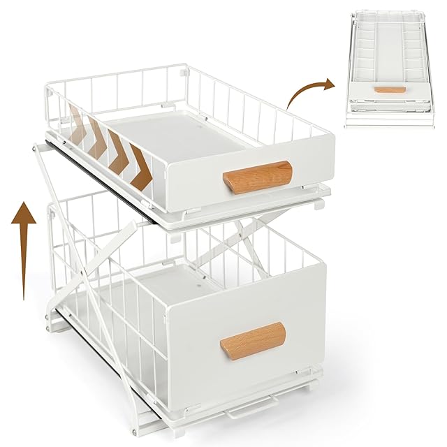 yazi シンク下収納 スライドラック 2段式伸縮可能 キッチン収納引き出し スライドレール付き 収納バスケット 穴開け不要 高さ3段階調整可能 シンクした収納 キッチンラック 台所・洗面台下 キッチン下収納棚 (L) | ascend