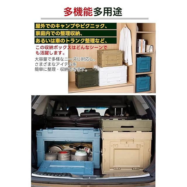 【室内外兼用&多機能】本製品は複数のサイズを用意しており、キャンプなどのアウトドアシーンでも大活躍。家庭ではベッド下収納、リビングの整理、車のトランク収納などに役立ち、防災グッズの保管にも適しています。