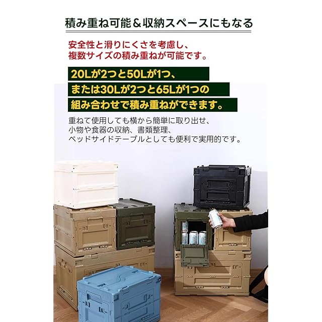 【積み重ね可能&収納スペースにもなる】: 安全性と滑りにくさを考慮し、複数サイズの積み重ねが可能です。20Lが2つと50Lが1つ、または30Lが2つと65Lが1つの組み合わせで積み重ねができます。重ねて使用しても横から簡単に取り出せ、小物や食器の収納、書類整理、ベッドサイドテーブルとしても便利で実用的です。