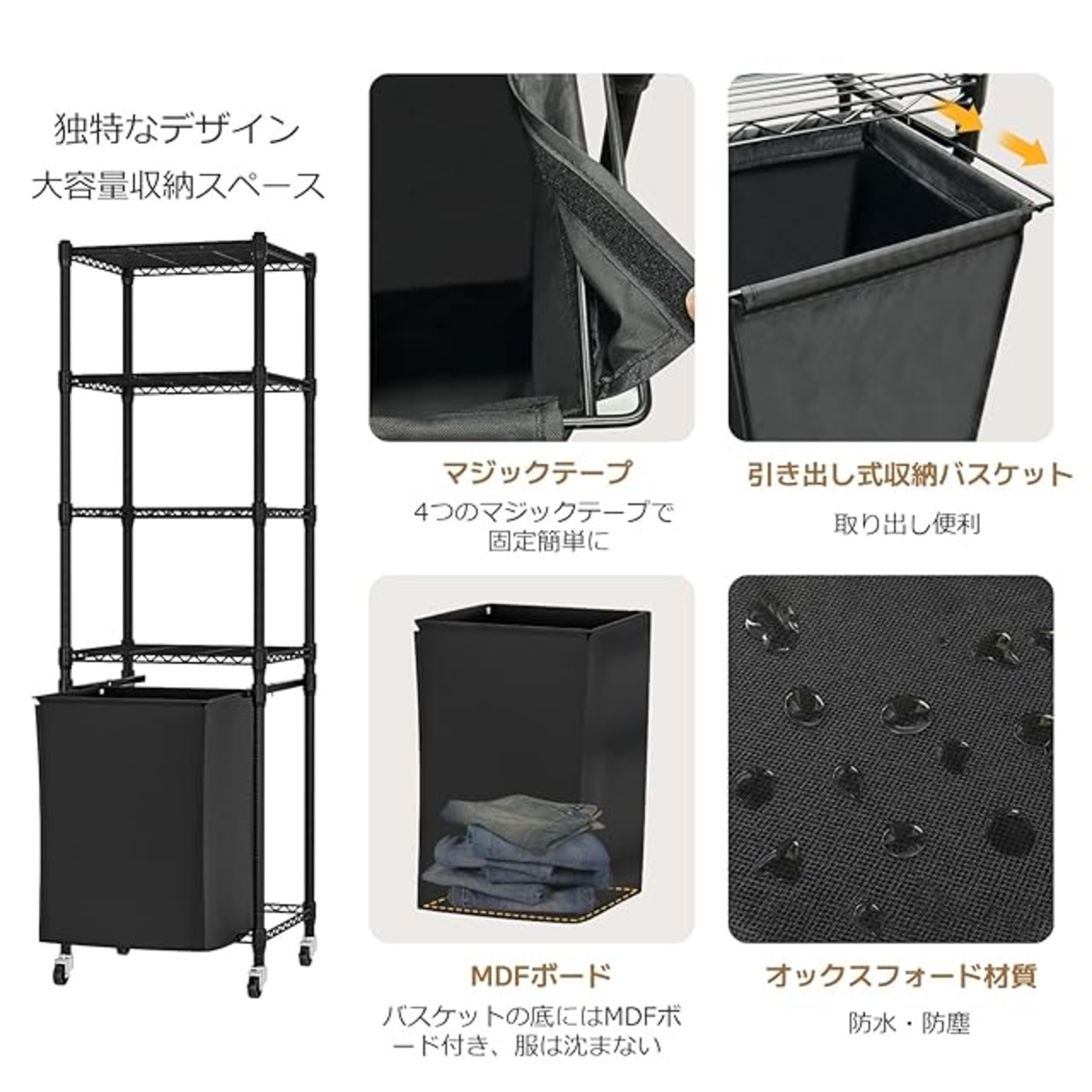 「収納ラック」ランドリーラックは汚れた衣類を収納できる洗濯カゴだけでなく、4段トレーもあります。トレーにはボディーソープ、洗面料等を収納でき、キッチン、リビングも使えます。普段でよく使う小物などの収納も大活躍です!