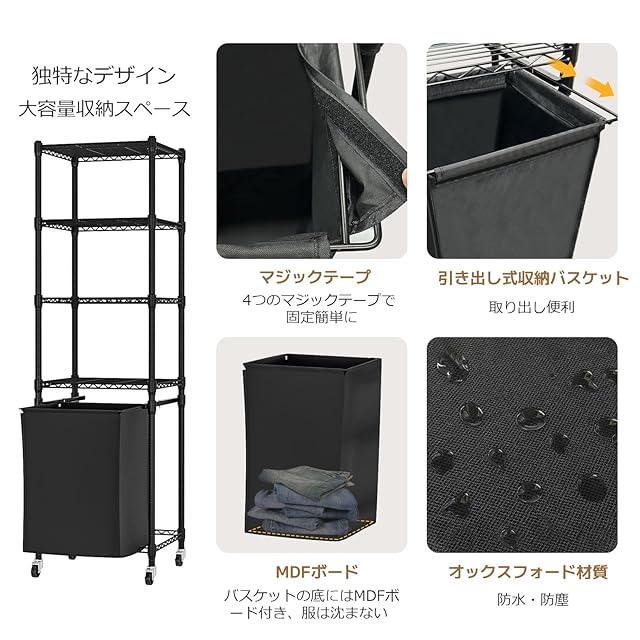 「便利」ランドリーラックのバスケットにはレールがあるので、取り外せば便利です。360度回転するキャスター付きで、楽に移動できます。ロック可能なキャスターが2つあり、移動する必要がないときに洗濯カゴの位置を固定できます。