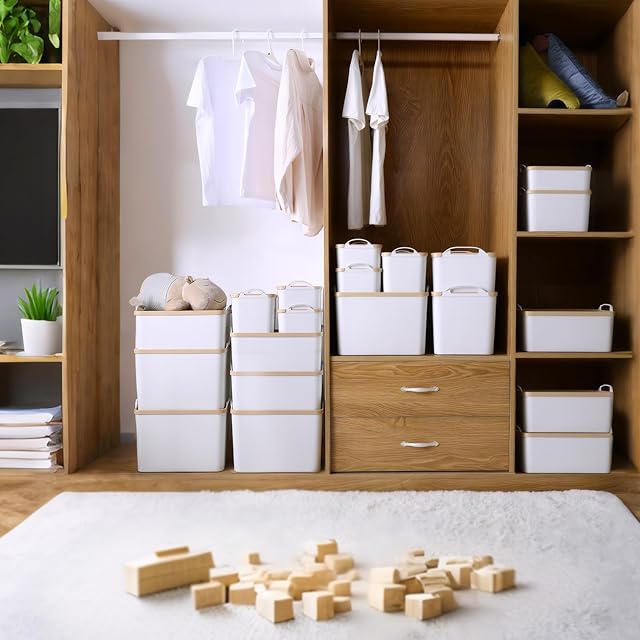 FITYE-KY 収納ケース 手提げ付き 茶色蓋付 3種類サイズ8個セット Sサイズ4個(25.8cm*18cm*高度10cm) Mサイズ1個(25.8cm*18cm*高度16cm) Lサイズ2個(36.5cm*25.8cm*高度16cm) LLサイズ1個(36.5cm*25.8cm*高度24cm)プラスチック ポリプロピレン PP樹脂 重ねる 中身が見えない収納ボックス(白)