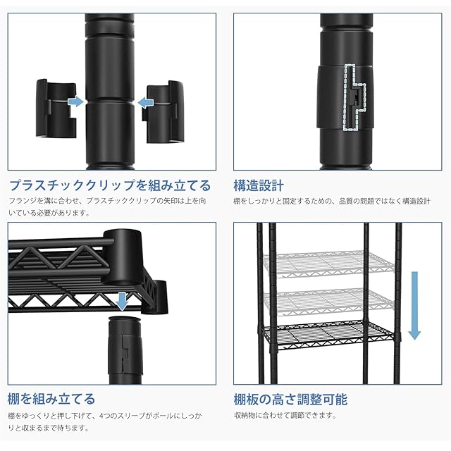 【棚板の高さは調節可能】ポールに設けられた2.5cm間隔の溝により、棚板の高さを変更できるため、収納する物に合わせて無駄なく最適なスペースで収納可能です。