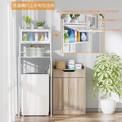 【扉付きラック収納】3段タイプ収納。洗濯用具をたっぷり収納できる一方、ホコリの防ぎにも効果あり、洗濯機の上のスペースも有効活用できます。実用と装飾を兼ねている置き型の収納棚です。