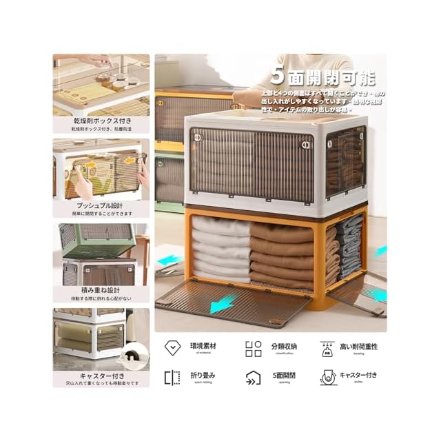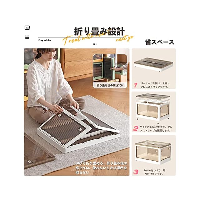 【折り畳み▪上に蓋/側面扉付き】収納箱界の大革新!使わない時に折りたたんで収納できます。スペースを取りません。側面四面も扉付き、収納にとても便利です。上にふた付き、物を入れやすい。蓋をロックできます。物を取るは側面扉から、ボックスを積み重ねる状態にも楽に物を取り出して、伝統的な収納ボックスに比べてもっと便利で、機能性が向上します。