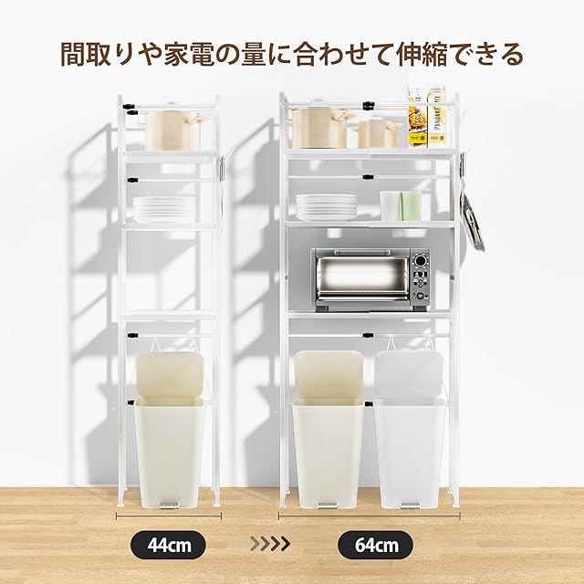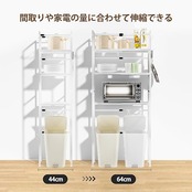 【横幅44~64cm伸縮】冷蔵庫横・洗濯機の隙間・三角コーナーなど、既存の家具や設備の間の「デッドスペース」に合わせて幅を調節可能です。隙間なくピッタリ収まるため、「ラックが場違い」にならず、一体感のある収納が実現できます。伸縮機能で無駄なスペースが生まれないため、ペット用品の収納とかで雑多な印象を防げます。