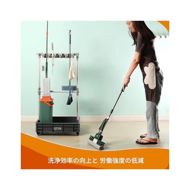 3. 効率的な清掃:車輪がついた掃除用具ホルダーを使用すると、全ての掃除道具を一度に簡単に移動でき、無駄な移動を減らし、清掃効率を向上させます。