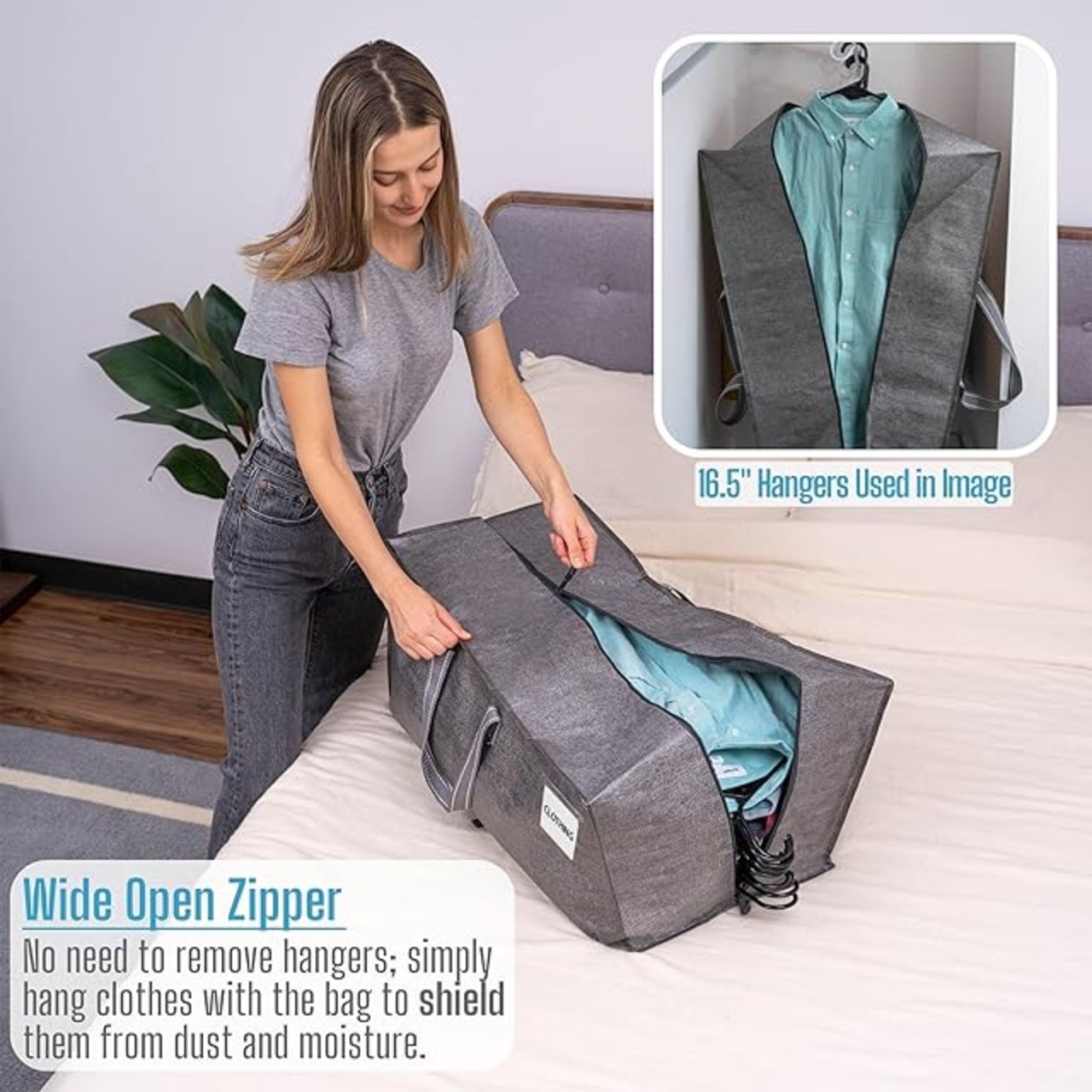 衣類ハンガーを取り外す必要はありません – 移動中にハンガーを衣類から取り外す手間を省きます。 ハンガーハンドルを上部に覗かせて服を中に入れ、ファスナーを閉め、荷を下すだけで、新しいクローゼットに再び衣類を掛けることができます。 このバッグは、バー付きのワードローブボックスに代わる優れた代替品です。軽量なデザインと簡単な持ち運びを組み合わせ、シームレスな移動体験を実現します。 バッグを使って吊り下げた衣類を覆うことで、ほこりや湿気から保護し、衣類を保護します。