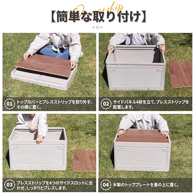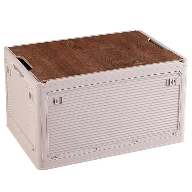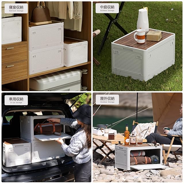 収納ケース 木製の蓋付き 全方向から取り出せる 積み重ね キャスター付き アウトドア 折りたたみコンテナ ボックス 大型 キャンプ コンテナボックス 組立簡単 多機能 厚み 強い耐荷重 大容量 家庭用 オフィス用 車用 寝室 衣装ケース おしゃれ