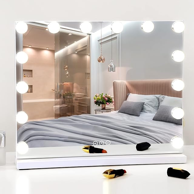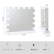 【15個led電球な大いミラー】- 鏡面サイズ58cm * 46cmの大型化粧鏡として、顔全体のバランスを確認することができる上に、ヘアスタイルとのバランスを取ることも便利です。前面だけではなく側面からも光が漏れ流れ、鏡の周りにライトが付いていたことによって、影を作らず顔全体を映せメイクがしやすい。ドレッサーや化粧台に設置し、ハリウッドな雰囲気でメイクをより快適にさせます。