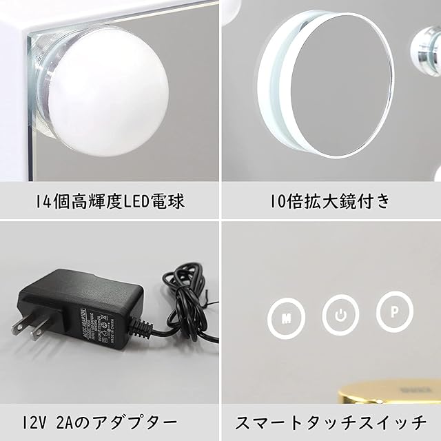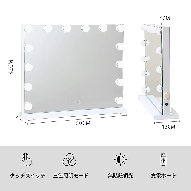 【14個led電球な大いミラー】-大型化粧鏡として、顔全体のバランスを確認することができる上に、ヘアスタイルとのバランスを取ることも便利です。前面だけではなく側面からも光が漏れ流れ、鏡の周りにライトが付いていたことによって、影を作らず顔全体を映せメイクがしやすい。ドレッサーや化粧台に設置し、ハリウッドな雰囲気でメイクをより快適にさせます。