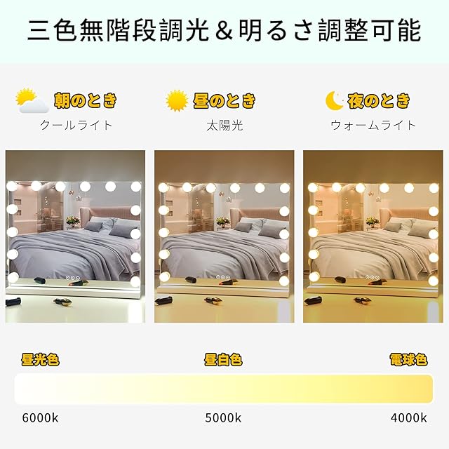 【3色照明モード】- このLEDメイクミラーは3色照明モードが切り替えられるため、時間帯や仕上げたい雰囲気などによって使い分けできる。天候や部屋の照明に影響を受けずに、いつも同じメイクができる。早朝でも深夜でも、さまざまなメイクのニ【3色照明モード】- このLEDメイクミラーは3色照明モードが切り替えられるため、時間帯や仕上げたい雰囲気などによって使い分けできる。天候や部屋の照明に影響を受けずに、いつも同じメイクができる。早朝でも深夜でも、さまざまなメイクのニーズに合わせて自由に明るさを無段階調整できる。ーズに合わせて自由に明るさを無段階調整できる。