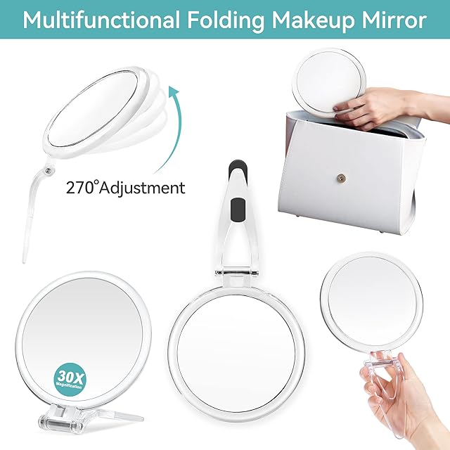 【等倍と30倍両面ハンドミラー】片面は通常で、もう片面は30倍拡大された詳細を提示します。 1X拡大ミラーはあなたの日常使用のための通常の高精細ミラーで、30X拡大ミラーは目の詳細のメイクに適しています。