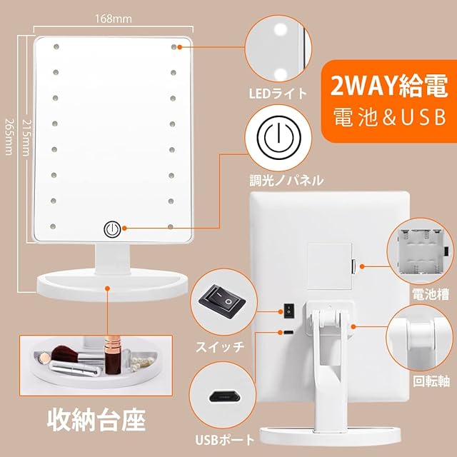 【USB&電池2 way電源供給】4つのAAA電池(付きません)で電源を入れるか、Micro USBケーブル(付きます)で、この素晴らしい卓上メイクアップミラーを給電することが出来ます。自宅など固定場所と移動先で電源がない場所も自由に使えます。メイクを楽にお楽しみいただけます。(※ご注意:充電ではなく、給電です。)