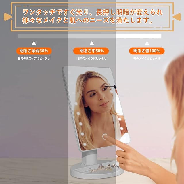 【タッチ式&明かさ調節可能】:前面にあるタッチ式調光パネルでは明るさの調節がいただけます。ミラーの下部中央にタッチパネルがあり、1回タッチするだけで電源をon/offになれます。長押しすると、ライトの明るさを調整する事ができます。とても大きなLED照明で安定した光を供給します。暗い場所や夜でも綺麗にメイクできます。
