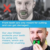 小臼歯と大臼歯を使用して歯を保護します-私たちのジョーラインエクササイザーは、押しつぶすための背中の歯に圧力をかけます。他のデバイスは、前歯に圧力をかけますが、これは切断のみを目的としています。これにより、曲がった歯が損傷する可能性があります。