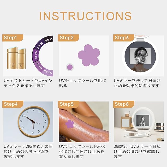 コンパクトなのに機能性にこだわり:折りたたみサイズは約110mmx18mm、薄く軽くて、化粧ポーチや小さいバッグなどに入れるコンパクトのサイズので、持ち運びに便利、携帯用の手鏡にぴったりです。使用シーンに合わせて角度を調整することができます。紫外線チェックカードも付き、日々の紫外線の強さをチェックすることができます。紫外線の強弱に合わせて日焼け止めを選んで、塗り直しの回数を決定し、肌にやさしい日焼け対策ができます。