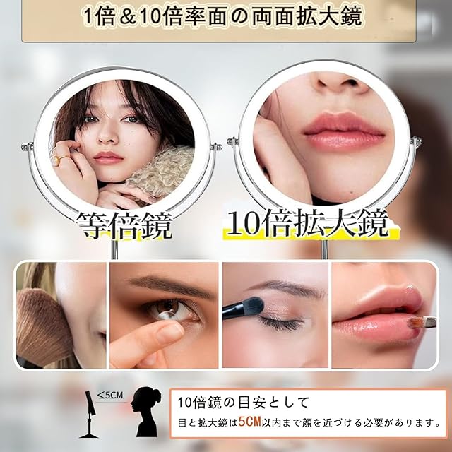 【等倍鏡&10倍拡大鏡の両面鏡】女優ミラー化粧鏡は等倍と10倍の拡大鏡が表と裏についており、必要に応じて回転させることで変えられます。等倍鏡は自然な姿を真実に映って、片面は気になる箇所を手早くチェックできる10倍拡大鏡。10倍拡大鏡はアイラインや毛穴カバーなど、顔の部位をクローズアップして入念にメイクを施すことができるので、プロに近い仕上がりにすることができます。老眼や目が悪い人でも上手にメイクやヘポイントメイクや眉カットをしたいときに重宝します。スキンケア、ニキビを潰すなど細かい作業もしやすい、お肌の細かいところまで隅々チェックできます。さらに、バスルームや洗面所などで使いたい方にもおすすめです。10倍拡大鏡面目安としては:目と拡大鏡は5cm以内の距離を持っているのはベストです。