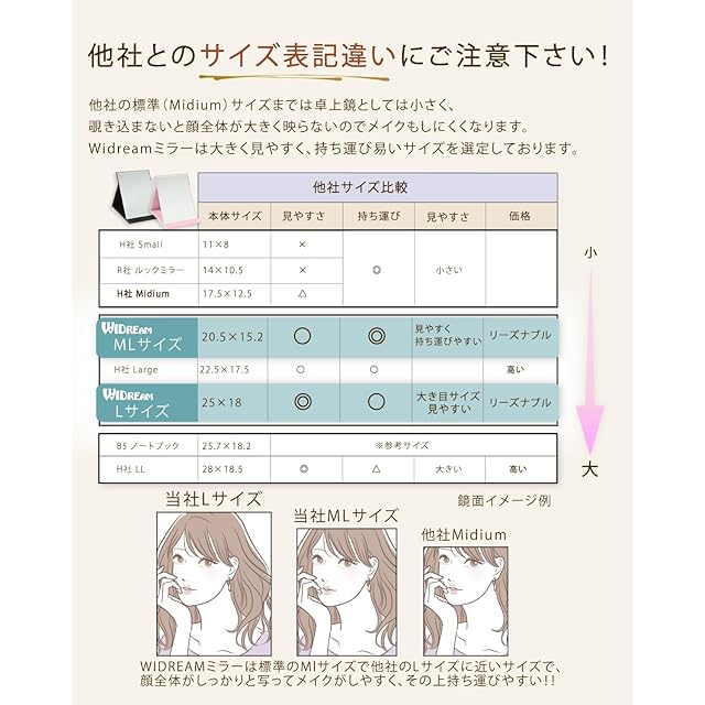 他社とのサイズ表記違いにご注意下さい。WIDREAM卓上鏡は他社より1サイズ大きくリーズナブル!!