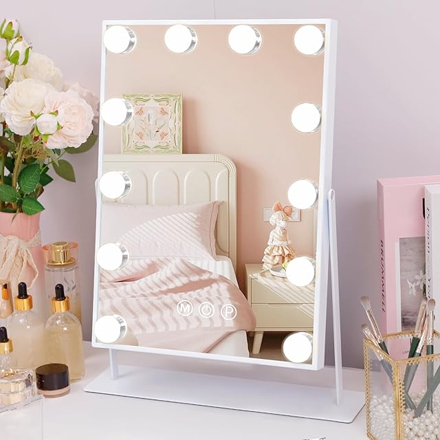 縦長タイプ女優ミラー:ちょうどいいサイズ女優ミラー、顔全体はもちろん、デコルテまで映せ、上半身の服装の雰囲気、ヘアスタイルとメイクのバランスを確認できます。12個大きなハリウッド式LED電球を採用し、時間帯や部屋の明るさに左右されずにライトで顔を明るく照らせ、女優さんの気分でメイクを楽しめます。
