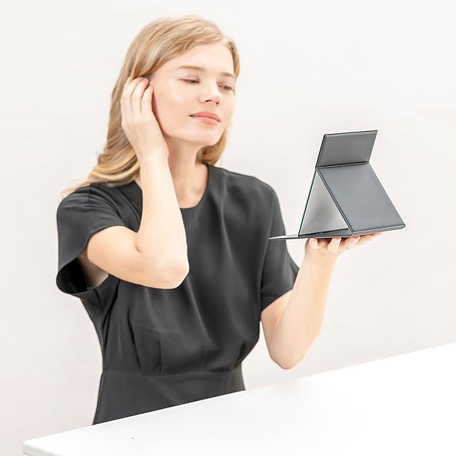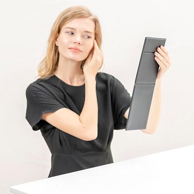 【軽量・コンパクト】従来の折りたたみミラー(当社比)よりも薄く軽いので、場所をとらずコンパクトに収納でき、引き出しやバッグに入れても邪魔になりません。旅行やお出かけ時など持ち運びに便利です。週刊誌のサイズ感。首元まで入るので、洋服との組み合わせもチェックできます。サイズ18.7cm×27.5cm、厚み0.85cm、重量約500g