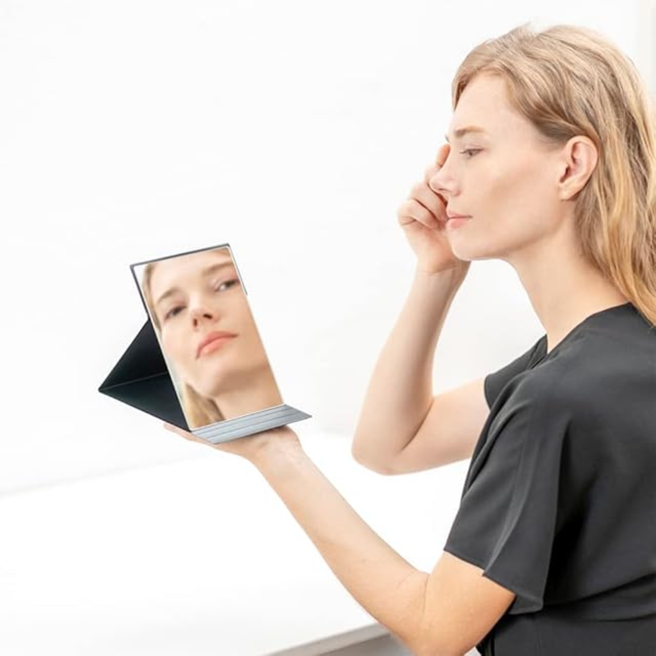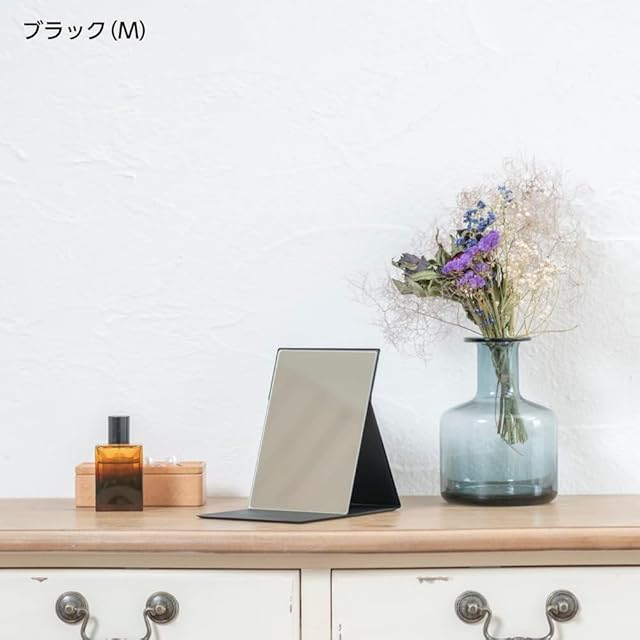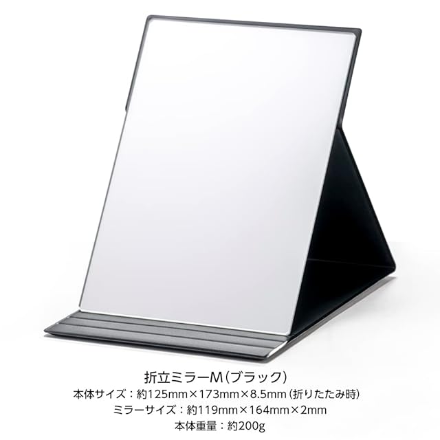 【軽量・コンパクト】従来の折りたたみミラー(当社比)よりも薄く軽いので、場所をとらずコンパクトに収納でき、引き出しやバッグに入れても邪魔になりません。旅行やお出かけ時など持ち運びに便利です。B6サイズの手帳と同じサイズ感で、バックに入れてもかさばらず、外出先でのメイク直しに便利です。サイズ12.5cm×17.3cm、厚み0.85cm、重量約200g