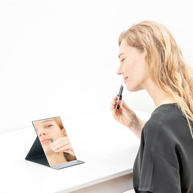 【軽量・コンパクト】従来の折りたたみミラー(当社比)よりも薄く軽いので、場所をとらずコンパクトに収納でき、引き出しやバッグに入れても邪魔になりません。旅行やお出かけ時など持ち運びに便利です。B5サイズのノートとほぼ同じサイズ。お顔全体が映りますので、ご自宅でのメイクに最適なサイズです。サイズ17.6cm×22.5cm、厚み0.85cm、重量約370g