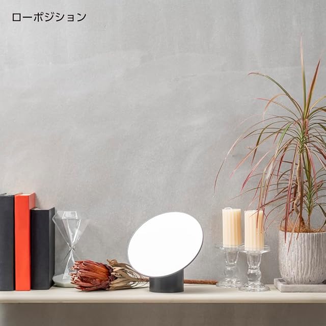 【使いやすい高さと角度で自由に止まる構造】お肌の手入れ、メイク、スタイリング。それぞれの用途に使いやすい高さと角度に調整ができます(特許出願中)。角度は自由に微調整できるトルクヒンジを採用。お肌のお手入れやメイクの時はディテールが見やすいローポジション、鏡の高さが10cm上がるハイポジションはスタイリングの時に、それぞれの用途に合わせて高さと角度が調整できます。