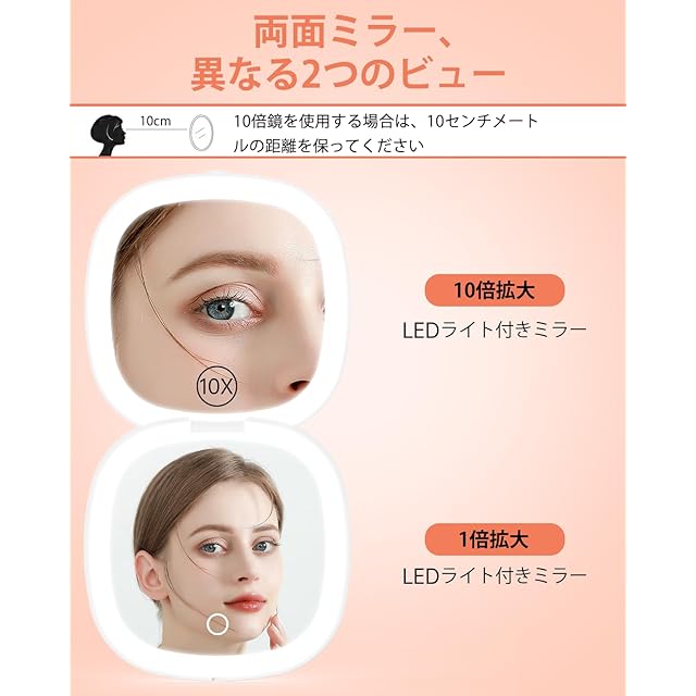 【1X倍 & 10X倍の拡大鏡】:当製品は、顔全体を確認するための1X倍率と、メイクを完璧にするために細部を拡大するための10X倍率の両方が備わっております。1X倍率を使用して自分の顔全体をよく観察し、10X倍率を使用して顔の詳細を拡大して、美しく仕上げましょう。