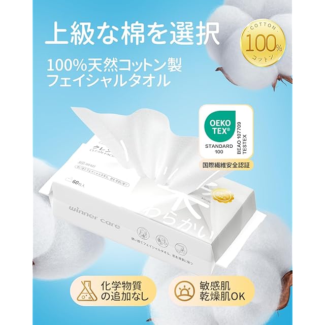 【全棉!厚手で柔らかいクレンジングタオル】Winnerクレンジングタオルは天然コットン100%で、厚さが50g/㎡と通常の2倍あるため、しっかりとした厚みと柔らかさを実現。蛍光剤や香料などの化学添加物は一切含まず、天然素材を使用しているため、敏感肌や乾燥肌の方にも安心してお使いいただけます。