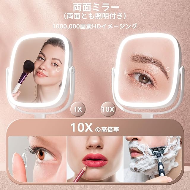 24cmスウィベル10X/1X拡大鏡: このライト付きスウィベルメイクミラーは、1Xと10Xのデュアル拡大鏡を搭載しており、精密なグルーミングやメイクに最適です。360度回転するデザインにより、柔軟な視点で使用でき、完璧なドレッサーアイテムです。 注意: 10X拡大鏡を使用する際は、最適な結果を得るために4インチ(10cm)以内の距離で使用してください。