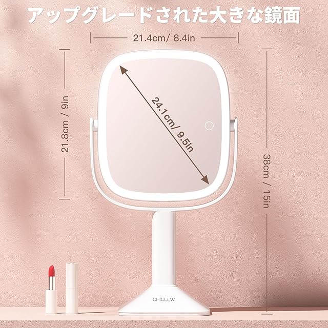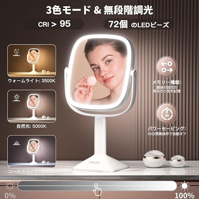 3色調光モード & 無段階調光: CHICLEWのライト付きミラーは、72個のLEDビーズを搭載し、暖色、冷色、自然光の3つの調光モードを備え、あらゆる作業に最適な照明を提供します。無段階調光により、明るさを簡単に調整して完璧なメイクやグルーミングが可能です。あらゆる照明条件に対応し、常に最良の状態で見た目をサポートします。