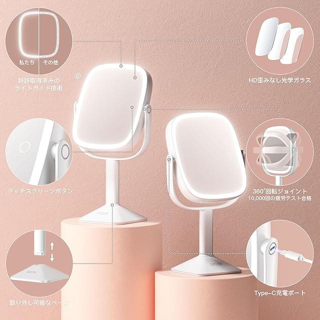 充電式卓上ミラー: 強力な2000mAhバッテリーとType-C急速充電対応で、このLEDミラーは長時間使用でき、最小限の充電時間で済みます。迅速で効率的な充電により、便利で途切れのないビューティールーチンをお楽しみいただけます。