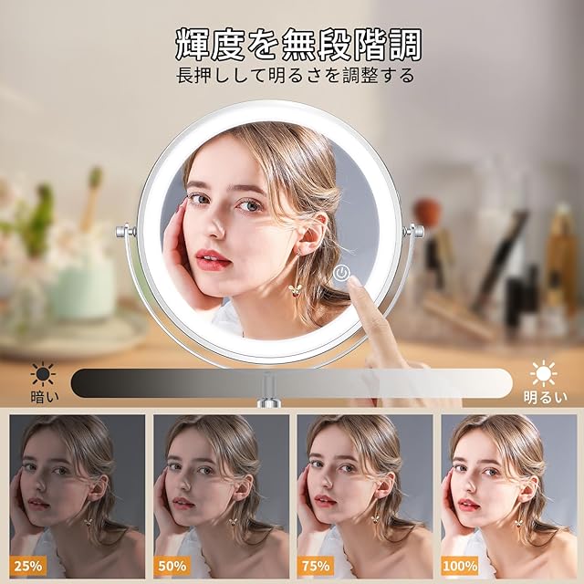 【3色の光+無段階調光】ワンタッチで「寒色」「自然色」「暖色」の3色に切り替えることができます。さまざまな照明条件で完璧なメイクを簡単に完成させることができます。明るい昼間、柔らかい夕暮れ、暗い夜など、シーンに応じて簡単に切り替えて、最適な光を手軽に取得できます。さらに、無段階調光機能もサポートしており、長押しで明るさを自由に調節することができます。どのような状況でも、最適な光量でメイクを仕上げることができます。初心者から上級者まで、どんな場面でも完璧なメイクを実現することができる化粧鏡です。