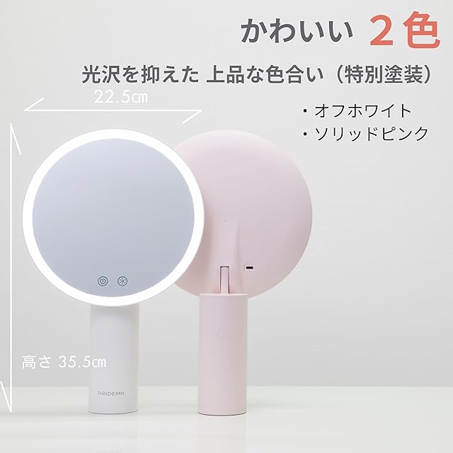 【かわいい・多機能】ポール型のスタンドミラーでオフホワイト、ソリッドピンクの2色、おしゃれでかわいい外観としました。明るさ無段階調光 3光色(昼光食/昼白色/電球色)、リチウムイオンバッテリーなど、卓上ミラーを楽しくご利用頂ける機能を搭載しました。