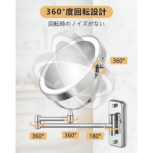 【 360°自由回転 】拡大鏡付き照明付きメイクアップミラーは360°回転可能です。 必要に応じてメイクアップミラーを好きな角度に調整でき、1倍側と10倍側を自由に切り替えることができます。