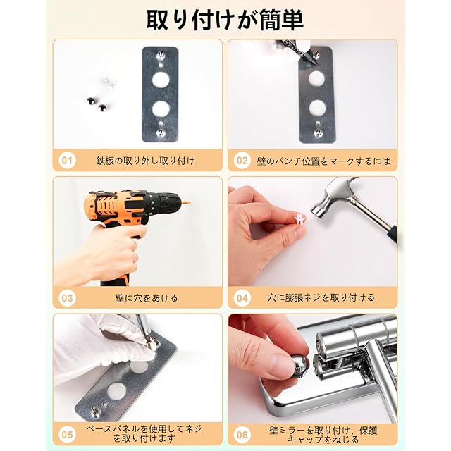 【3色の照明と無段階調光】この洗面台用壁掛けミラーは、温かみのある白色で自然な光を提供します。 周囲の状況やメイクアップの必要性に合わせて、ミラーの照明パターンと明るさを調節できます。 タッチセンサースイッチを短く押すと、3つの光の色が変わります。 長押しで明るさを調節できます。