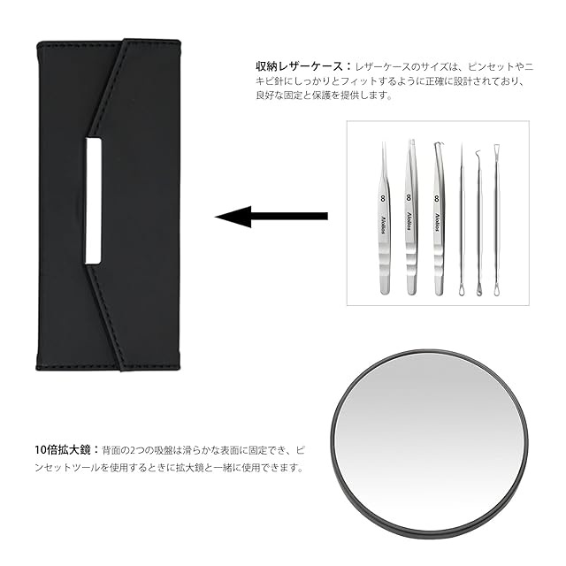【パッケージ内容】:先鋭ピンセット、平口ピンセット、湾曲フックピンセット、超鋭利なニードル(?0.05mm)/圧力円の拡大、湾曲したニードル/お椀型圧力リング、三角形の圧力リング/圧力円の拡大、10倍鏡、収納レザーケース、取扱説明書。取扱説明書が同封されており、初心者の方でも簡単に使用することの出来るセットとなっております。毛穴や顔の角質、角栓、黒ずみ、いちご鼻、プラモデルなど様々なお客様のニーズに対応しております。