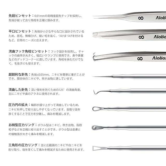 【最高規格 毛穴ケアツール 】:AioBos 毛穴ケアツールでは、仕上げ精度における最高研磨規格「8」ランクを採用。最高規格「8」では、防錆性、抗菌性、高耐久に優れ、更に省力設計により使用を続けても疲れにくい品質となっております。また、ピンセット先端精度も高く、どんな小さな物も的確に掴めます。セットには収納ボックスが付属しています。使用後のピンセットは、工具の精度を守るために収納ボックスに保管できます。