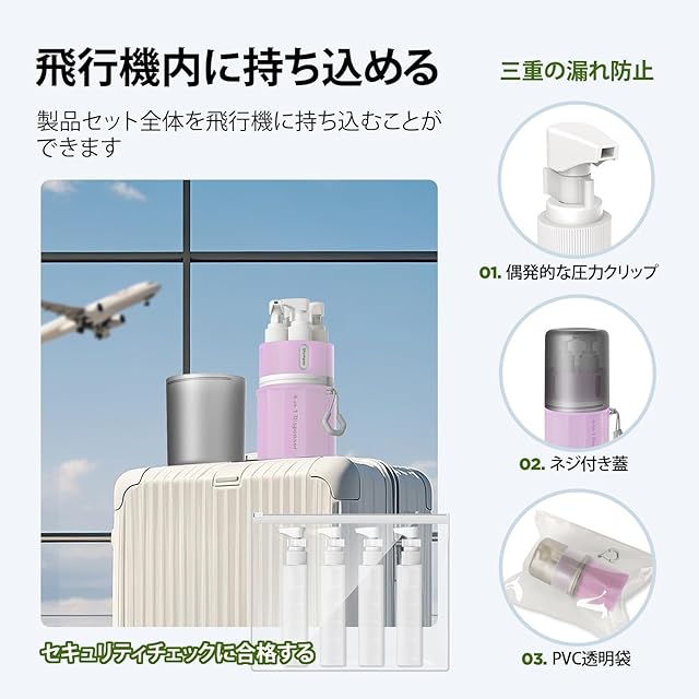すべてのボトルは蓋付きのシリコーンストレージボックスにきちんと収納されており、各ディスペンサーボトルには漏れ防止バックルが装備されています。透明な漏れ防止バッグは旅行中に追加の保護を提供し、二重の漏れ防止設計により100%の漏れ防止を保証し、長旅や日常使用に適しています。