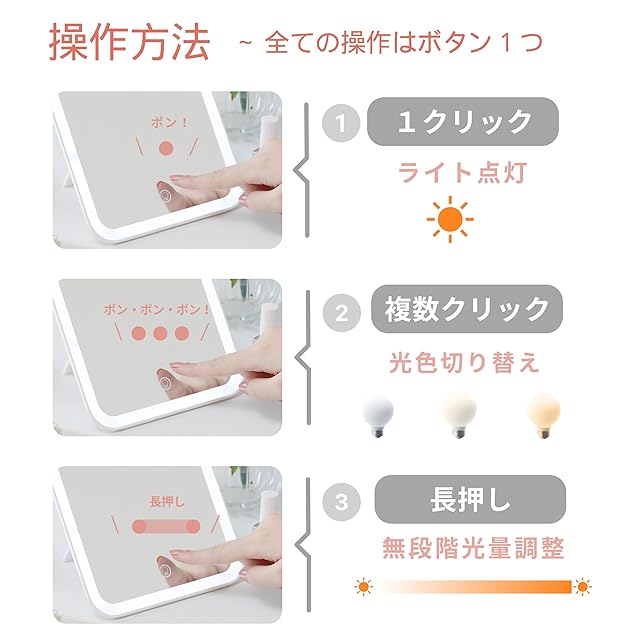 【明るさ無段階調整・3光色】無段階調整のLEDライトにより、暗い場所でもお顔を明るく照らします。ミラー面のタッチパネルで、光色の切り替え(昼光食/昼白色/電球色)が可能です。