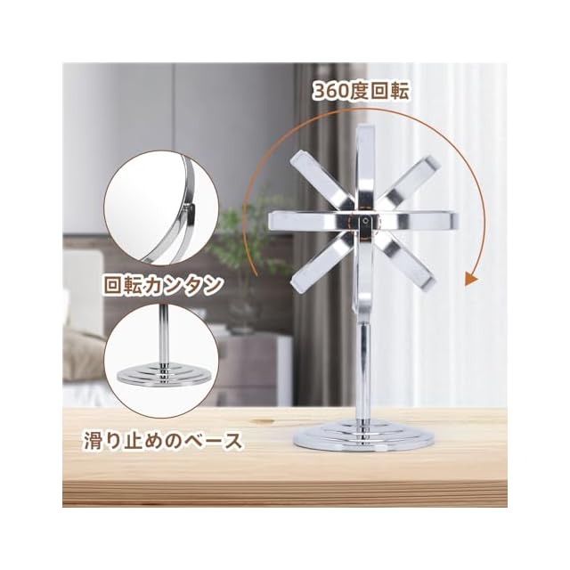 カウンタートップや洗面化粧台などに設置できる360度回転の両面ミラー。