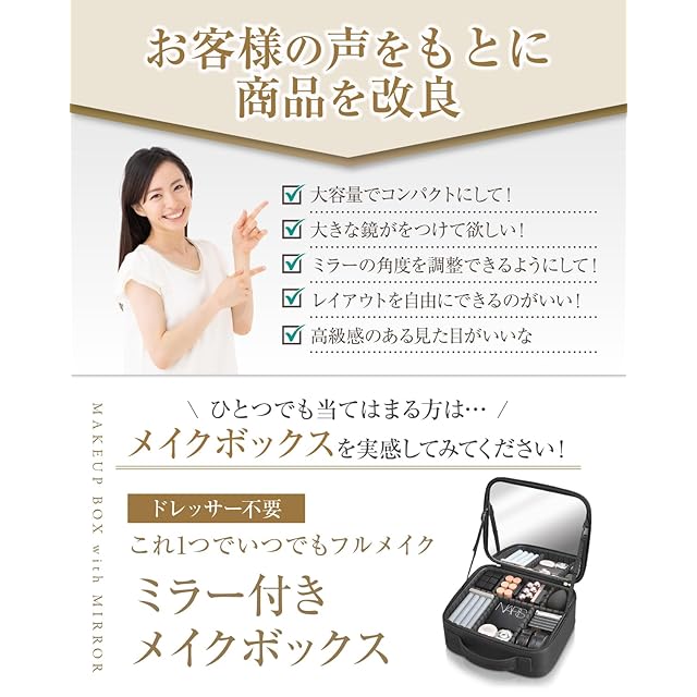 【 持ち運びがらく】コンパクトで持ち運びやすいデザイン。持ち手付きだから持ち運びが楽なのはもちろん、耐久性が高いPUレザーを使用しているから摩耗や破損に対して強く、ツースケースに入れて旅行にも最適。 旅先でもいつものメイクができる。
