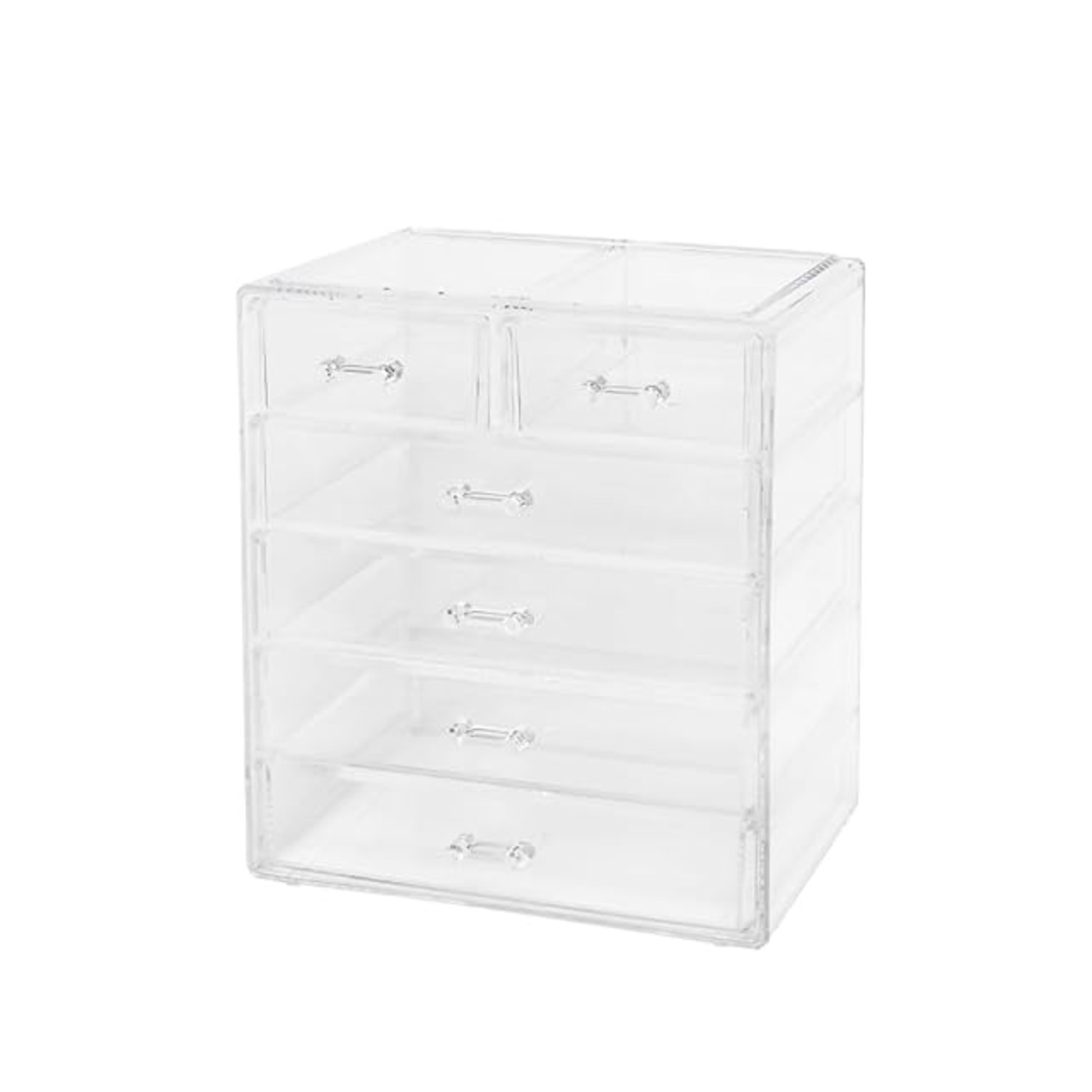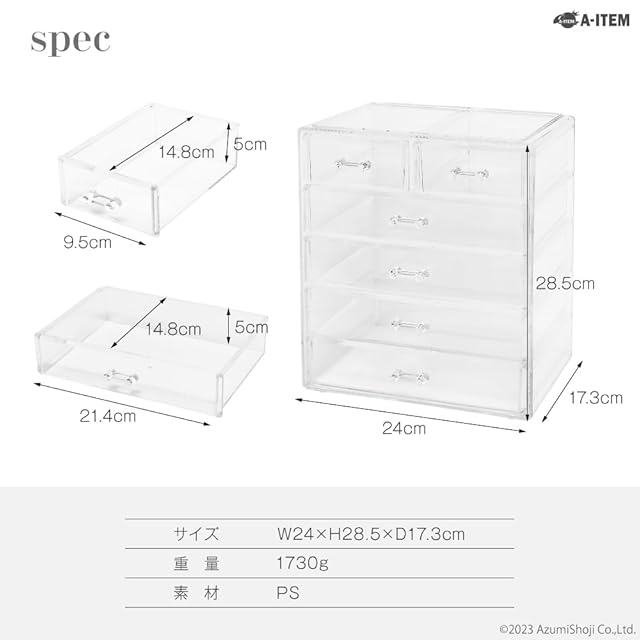 収納スペースが6つに分かれている大容量のコスメボックス。サイズはW24xH28.5xD17.3㎝あり、沢山収納出来ます。収納場所に困ってる人や、無くしてしまう人にもおすすめ。アイシャドウ、リップ、マスカラ、等々、コスメ一式収納出来ちゃう。 クリアタイプなので部屋の家具とも相性がよく、中身も一目で認識出来ちゃう。収納した状態なのにお気に入りのコスメを眺めることも。 素材はPS(ポリスチレン)なので汚れても水洗いも出来き、ずっと清潔な綺麗な状態で使う事が出来ますよ。 コスメだけでなくアクセサリーやジュエリーなんかも収納したり、あなたのよろしいように。