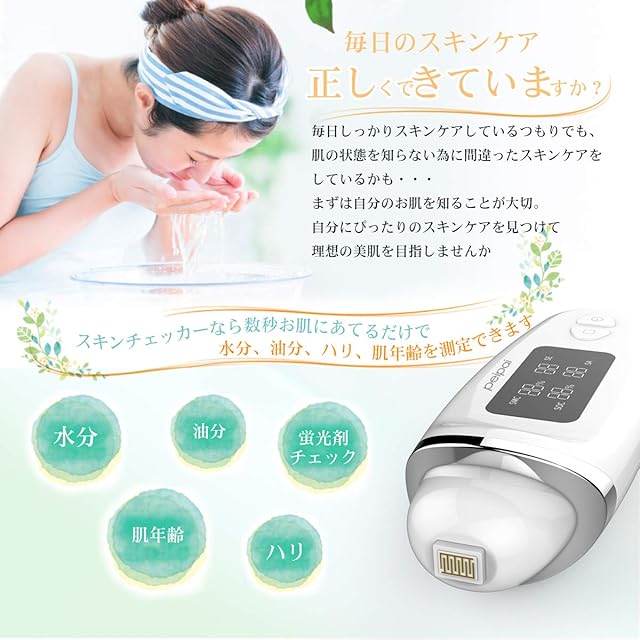 <b>【Sunface 充電式肌チェッカー】肌の水分、油分、弾性、肌年齢を簡単測定。</b><br><br> <b>測定機能が豊富</b><br> sunface スキンチェッカーは、肌のスキンケアを見直すための指標にもなってくれます。例えばスキンチェッカーで乾燥肌だと診断されれば、保湿クリームなどで保湿ケアを行います。このように肌の状態を知ることで、自分の肌に必要なスキンケア製品を見極めることができるのです。<br> 肌センサーをお肌に当てるだけでお肌の水分量と油分量を測定し、結果を%表示で分かりやすくお知らせします、また、肌の弾性と年齢を測定することもできます。<br> sunface スキンチェッカーは、自分の肌の状態を知りたい人、自分に合ったスキンケア方法を見つけたいという人におすすめの製品です。<br><br> <b>液晶パネル表示下記の通り:</b><br> SMC: 水分<br> SOC: 油分<br> SE: 弾性<br> SA: 肌の年齢<br><br> <b>改良された肌センサーにより測定精度が高まる</b><br> Sunface はスキンチェッカーの測定精度を考慮して肌センサーを改良しました、市販スキンチェッカーによく見られる肌センサーと比べると、Sunfaceスキンチェッカーのセンサーは肌との接触面が広いため、測定精度がより高い、それに、肌に押し当てる際、痛みなどはありません。<br><br> <b>肌に軽く押し当てるだけのスピード測定</b><br> 測定部分を肌にそっと押し当てるだけで、自動的に測定が始まります。 あっという間に水分量も脂分量も結果が出るから、毎日のチェックが苦になりません。<br><br> <b>10回分の測定結果を自動保存</b><br> 今日の肌は昨日と比べてどう変わったか、お手入れを続けてどう変化したかを把握するのも、美肌への近道です。 お肌の変化を日々チェックするようにしましょう。<br><br> <b>蛍光剤チェック</b><br> 化粧品やパックなどに、お肌に悪影響を与えると言われている蛍光剤が入っているかを調べることができるブラックライトを搭載しています。蛍光剤が含まれていると、ブラックライトを当てた際に反応して蛍光剤が発光します。<br><br> <b>USB充電式</b><br> 便利なusb充電式、220mah大容量のリチウムイオン電池搭載、一度フル充電できましたら、長い間ご利用いただけますので頻繁に充電する必要がありません。<br><br> <b>コンパクトサイズ</b><br> 小さくて可愛い手のひらサイズで持ち運びも便利です.<br> サイズ : 高さ122×幅34×厚さ25mm<br>