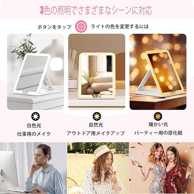 【3色のライト&無段階の明るさ】ワンタッチでライトをオンオフし、電球色・白色光・自然光といった照明モードも簡単に切り替え可能です。更に、無段階調光機能をサポートしており、長押しで明るさを自由に調整することができます。どのような状況でも、最適な光量でメイクを仕上げることができます。初心者から上級者まで、どんな場面でも完璧なメイクを実現することができる化粧鏡です。