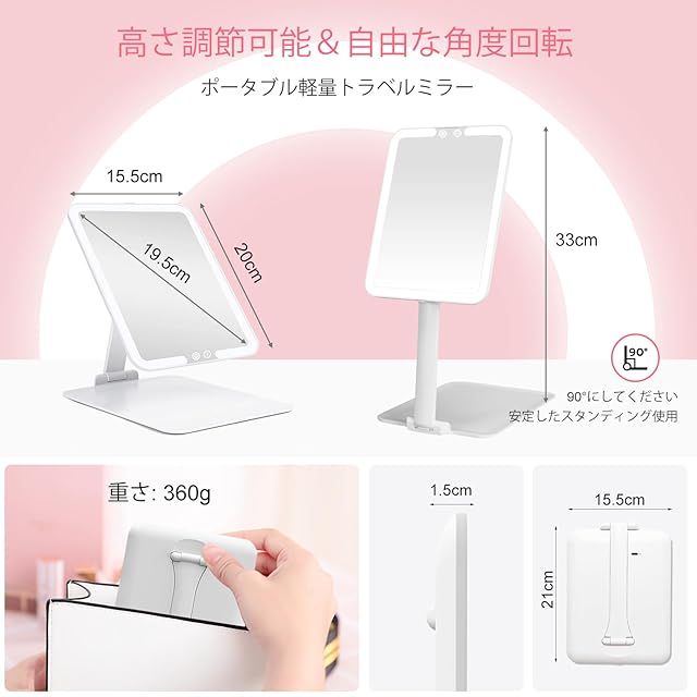 【軽量&携帯便利】化粧ミラーのサイズは約21*15.5*1.5cmで、重さは約360gです。簡単に折りたたんでバックパックやスーツケースに入れることができ、旅行中でもいつでもメイクアップできます。ベルベットの収納袋が付属します