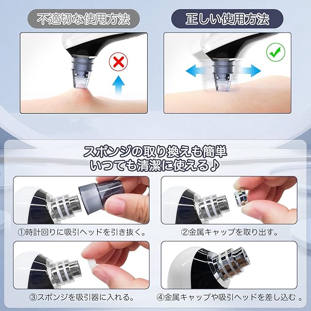 ♪【4種類の吸引ヘッド】様々なタイプの吸引ヘッドがついており、3段階の吸引力とを合わせて使用できます。