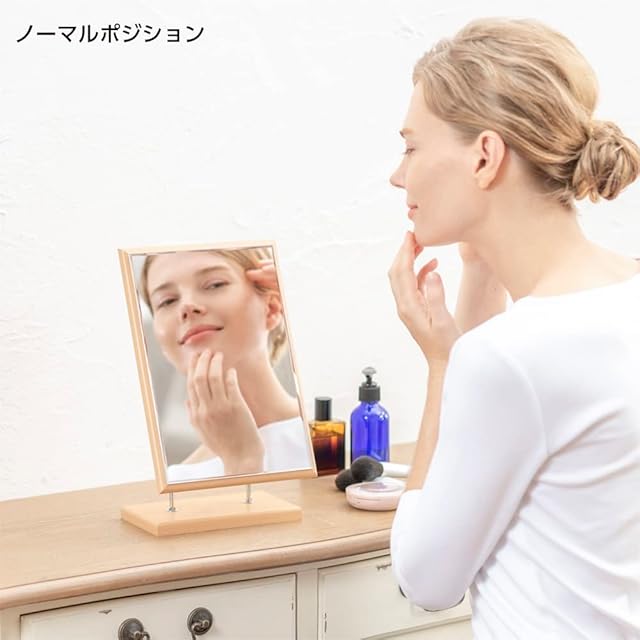 高さを2段階に調整できる卓上ミラー。鏡面をくるっと回転させれば高さ31.5cmのノーマルポジションから42.5cmのハイポジションへと鏡の高さを2段階選択できます。 お肌のお手入れやメイクの時はディテールが見やすいローポジション、鏡の高さが11cm上がるハイポジションはスタイリングの時に、それぞれの用途に合わせて高さと角度が調整できます。 木目調のフレーム, スタイリッシュでシンプルなデザインはインテリアとしてお部屋の雰囲気に溶け込みます。 台座とフレームにMDFという中質繊維板を使用しています。MDFはカラマツ、スギ、リサイクル素材などから作られており、環境に優しい素材になります。 サイズ 【ノーマルポジション】 幅20cm×奥行10cm×高さ31.5cm 【ハイポジション】 幅20cm×奥行10cm×高さ42.5cm 重量 約910g