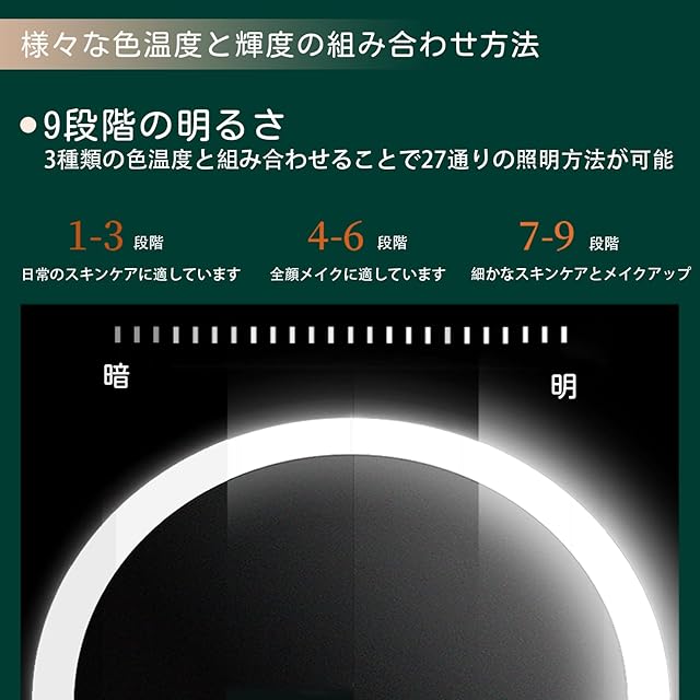 【3パターンのカラー調整&27段階の明るさ調節】ミラー表面のタッチキーを使って光の色合い(昼白色/昼光色/電球色)を切り替えることができ、異なる環境でメイクをチェックすることができます。また、メモリ機能があり、自動的に前回の色を表示できます。 「+」「—」を軽くタッチして明るさを調整し、9段階の明るさと3つの色温度で27種類の照明モードを使用できます。